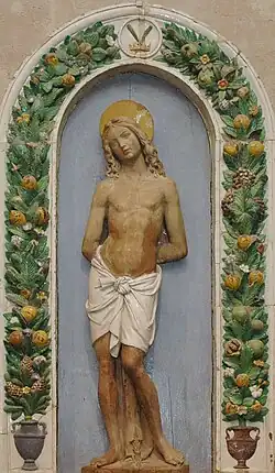 One of his finest works is a large retable at Volterra in the church of San Girolamo, dated 1501; it represents the Last Judgment, and is remarkable for the fine modelling of the figures, especially that of the archangel Michael, and a nude kneeling figure of a youth who has just risen from his tomb.[1] Another work that equalled that anything of his father's, from whom the design of the figures was probably taken, is the washings fountain in the sacristy of the Basilica of Santa Maria Novella at Florence, made in 1497.[2] It is a large arched recess with a view of the seashore painted on maiolica tiles at the back. There are also two painted maiolica panels of fruit trees let into the lower part. In the tympanum of the arch is a white relief of the Madonna between two adoring angels. Long coloured garlands of fruit and flowers are held by nude boys reclining on the top of the arch and others standing on the cornice. All this part is of enamelled clay, but the basin of the fountain is of white marble.[1]