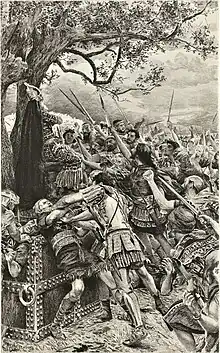 Hamilcar in retaliation killed his 4,000 prisoners. From this point, neither side showed any mercy, and the unusual ferocity of the fighting caused Polybius to term it the "Truceless War".[44][47] Any further prisoners taken by the Carthaginians were trampled to death by elephants, while the rebels crucified numerous captured Carthaginians.[48][49] In 238 BC at the Battle of the Saw, Hamilcar took Spendius and nine of his principal lieutenants prisoner during a parley and in turn had them crucified.[50][51]