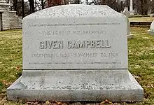 Retiring to Paducah, Kentucky, Given Campbell built a home and lived there a few months. While visiting Saint Louis, Campbell died after a short illness on November 20, 1906, and was survived by his wife and three children, viz: Dr. Given Campbell, Jr; Susan C. Evans (née Campbell), wife of Albert D. Evans; and lawyer James C. Campbell. Given Campbell is buried at Bellefontaine Cemetery in St. Louis, Missouri in Plot Block 112, Lot 56.