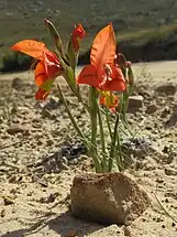 Gladiolus alatus produces large orange flowers.[3] Each plant has between two and eight flowers borne in a spike inflorescence. The lower halves of upper lateral tepals are covered in red hairs, the areas between them thickened into hairy, iridescent ridges.[4] The lower tepals are yellow-green towards the base with orange tips.[5] The funnel-shaped perianth tube is 10–14 mm (0.39–0.55 in), with anthers and stamens arising near the middle.[4][5] The arched filaments are hairy and green or yellowish in colour with purple lines and bear stamens with yellowish pollen[4] They are present between August and October and have a sweet scent.[4][5] Each flower lasts about a week.[5] The green floral bracts are strongly keeled and have purple margins. The inner bracts are slightly shorter and have two keels.[4]