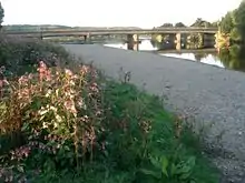 Glasbury Bridge has repeatedly been destroyed by floods. A wooden bridge was washed away in 1738, a replacement in 1777 and a stone bridge in 1795.[23] In 1850, a dispute between Brecknockshire and Radnorshire over costs for a new bridge led to the construction of a compromise half-wooden (Radnorshire), half-stone (Brecknockshire) bridge. The current six-span masonry bridge was built in 1923.[24]