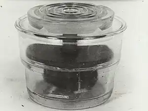 The mine consists of a glass bowl, six inches (15 cm) in diameter containing an explosive charge and a detonator. The top of the mine was covered by a sheet-glass disk 0.25 inches (6.4 mm) thick, under a thick, moulded glass pressure plate. Each mine was supplied with a small quantity of cement putty to seal gaps between the main body and the glass disk cover and make the mine waterproof.[2]