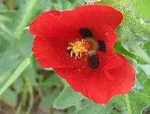 Glaucium corniculatum, the blackspot hornpoppy[2] or red horned-poppy,[3] is a species of the genus Glaucium in the poppy family (Papaveraceae). It is an annual flowering plant, occurring in southern Europe, and grows up to 1 foot (30 cm) high. The stem and leaves are hairy, the capsule fruit is covered with stiff hair, the flower is red, with a black spot on the base of the tepal bract, which has a yellow margin around it. The flower appears from June until August.