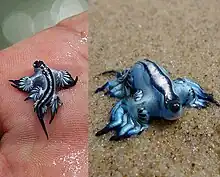 Glaucus atlanticus (common names include the blue sea dragon, sea swallow, blue angel, blue glaucus, dragon slug, blue dragon, blue sea slug, and blue ocean slug) is a species of small, blue sea slug, a pelagic (open-ocean) aeolid nudibranch, a shell-less gastropod mollusk in the family Glaucidae.[2]