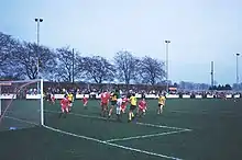 Unusually, the largest stand in the ground was built behind the goal, rather than the side opposite the Main Stand.[3] This was because that side is constrained by a terrace and the Glebe Park hedge, which runs past more than half of the pitch.[3][4][5] The hedge was threatened in 2009 because Glebe Park's pitch dimensions were too small for it to meet UEFA requirements, at just 67 yards wide.[3][4][5] A fine was suspended by the SFA because Brechin City carried out some work to resolve the problem.[6] There is a small training pitch behind the hedge.