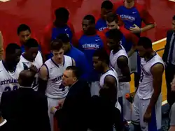 Coach Braica huddling with his team on December 10, 2015, against NJIT at The Pope.