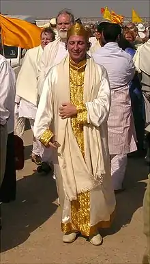 Some "national leaders" and "top officials" of the Global Country of World Peace are called Rajas.[51][56] In 2005, 22 male Rajas were appointed by the Maharishi as national and regional leaders of his organization. His Raja training course took about two months and the participants were "advised to make a contribution of $1,000,000 to the Maharishi World Peace Fund."[51][57] Ceremonial attire for the Maharaja and the rajas includes white silk robes, gold medallions, and gold crowns.[58][59] In 2008, Nader attended the Maharishi's funeral in India[56][60] and adopted the title, "Maharaja Adhiraj Rajaraam".[61] Since then the organization has also been administrated by the "high-functioning intellectual elite in its upper echelons," such as Bevan Morris, Maureen Wynne, and Willy Koppel,[62] while retaining Nader as the central leader.[51]
