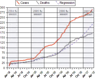 - February 28, 2008: There are no indications that H5N1 is becoming a bigger problem in China despite the deaths of three people from the disease this year, the World Health Organisation said Wednesday.[21]