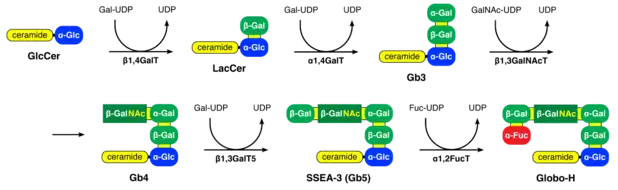 Globo H's biosynthetic pathway is involved in the synthesis pathways of other globo-series glycosphingolipid antigens that are also specific to cancer cells, including stage-specific embryonic antigen-3 (SSEA3) and stage-specific embryonic antigen-4 (SSEA4).[1] The biosynthetic pathway of these antigens includes the enzyme β 1,3-galactosyltransferase V (β3GalT5).[1] β3GalT5 catalyzes the galactosylation of globoside-4 (Gb4) to SSEA3.[1] SSEA3 can then be converted to SSEA4 by sialyltransferase adding a sialic acid group to its end, or it can be converted to Globo H by fucosyltransferase adding a fucose ring to its end.[1] Playing a part in the formation of three different cancer-specific antigens, β3GalT5 is of particular interest in its relevance to cancer treatment, and it has been shown to be critical for cancer cell survival.[8]