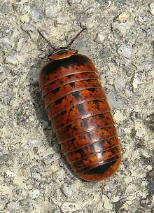 Glomeris klugii exhibits a wide range of colour variation. Many colour morphs and subspecies exist, each displaying unique colour patterns.[2] The base colour of the species typically ranges from light brown to red,[2] with many possessing vividly coloured chitin and a distinct marbled pattern.[3] However, the presence of black freckles on their bodies varies, with some individuals having freckles that fuse into larger spots, while others are fully black in colour.[2] G. klugii can reach a length of about 13.5 mm (0.53 inches) and a width of up to 6.25 mm (0.24 inches).[3] Telopods exhibit syncoxite with slight variations in the central lobe shape and delicately bifurcated coxal horns.[3] G. klugii also lacks a main stria on the thoracic shield.[2]