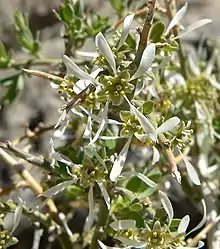 These are usually small shrubs, although Glossopetalon spinescens can reach up to three metres in favoured locations. They have thorny, tangling branches and white flowers with petals that are easily shed, giving them an untidy appearance.[1][2] G. pungens is not thorny, and is a vertically prostrate subshrub which is usually found as a small tangled mat of stems hugging sheer cliffs.[3]