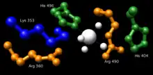 Essential residues in the active site of vanadium haloperoxidases include: Lys353, Arg360, Arg490, His404, and His496. Corresponding residues in the active site of glucose 6-phosphatase-α include Arg170 and Arg83, which donate hydrogen ions to the phosphate, stabilizing the transition state, His119, which provides a proton to the dephosphorylated oxygen attached to glucose, and His176, which completes a nucleophilic attack on the phosphate to form a covalently bound phosphoryl enzyme intermediate.[1] Within the Vanadium-containing chloroperoxidase, Lys353 was found to stabilize the phosphate in the transition state. However, the corresponding residue in glucose 6-phosphatase-α (Lys76) resides within the ER membrane and its function, if any, is currently undetermined. With the exception of Lys76, these residues are all located on the luminal side of the ER membrane.[4]