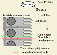 Some alpha gliadin have other direct-acting properties. Other gliadin peptides, one in a glutamine rich region and another peptide, "QVLQQSTYQLLQELCCQHLW", bind a chemoattractant receptor, CXCR3. Gliadin binds to, blocks and displaces a factor, I-TAC, that binds this receptor.[2] In the process it recruits more CXCR3 receptor, increases MyD88 and zonulin expression.[1][9] The factor it displaces, I-TAC, is a T-cell attractant. This peptide may also be involved in increased risk for type 1 diabetes as zonulin production is also a factor.[10] This triggering of zonulin ultimately results in the degradation of tight junctions allowing large solutes, such as proteolytic resistant gliadin fragments to enter behind the brush border membrane cells.