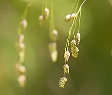 Flowers are produced in a panicle typically between June and September depending on location.[4] The panicle is typically open, containing few spikelets and each spikelet tends to droop giving the overall inflorescence a curved shape. Each spikelet is 3-5mm long and contains 5-10 individual florets. The lemmas are 2.9-4mm long.[3]