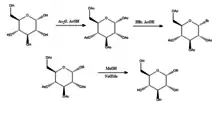 Joshi et al. (2006)[6] propose the Koenigs-Knorr method in the stereoselective synthesis of alkyl D-glucopyranosides via glycosylation, with the exception of using lithium carbonate which is less expensive and toxic than the conventional method of using silver or mercury salts. D-glucose is first protected by forming the peracetate by addition of acetic anhydride in acetic acid, and then addition of hydrogen bromide which brominates at the 5-position. On addition of the alcohol ROH and lithium carbonate, the OR replaces the bromine and on deprotecting the acetylated hydroxyls the product is synthesized in relatively high purity. It was suggested by Joshi et al. (2001) that lithium acts as the nucleophile that attacks the carbon at the 5-position and through a transition state the alcohol is substituted for the bromine group. Advantages of this method as well as its stereoselectivity and low cost of the lithium salt include that it can be done at room temperature and its yield compares relatively well with the conventional Koenigs-Knorr method.[7]