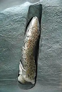 Fossilized remains of Gnathorhiza have been discovered within burrows at various localities, including the Wellington, Arroyo, and Matfield formations.[1][7][8] These burrows were likely constructed by the lungfish for aestivation, a behaviour observed in extant Lepidosiren and Protopterus lungfish, and the examined Gnathorhiza burrows are similar to those of extant lungfish. However, Gnathorhiza would have evolved this behavior independently from the extant taxa. In the Arroyo Formation, burrows ranged from 4 to 14 centimeters in diameter.[9] Judging from the lithology and form of the burrows, Gnathorhiza used its mouth to excavate them.[1] During aestivation, the fish would have stood within the burrow on its tail, which was stout and strong to support the animal in this position.[7] At some localities, intersecting burrow structure indicates repeated burrowing cycles, and that alternating wet and dry seasons were present.[1]