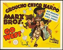 Go West is a 1940 American Comedy Western film from Metro-Goldwyn-Mayer starring the Marx Bros. In their tenth film, (Groucho, Harpo, and Chico) head to the American West and attempt to unite a couple by ensuring that a stolen property deed is retrieved. The film was directed by Edward Buzzell and written by Irving Brecher.