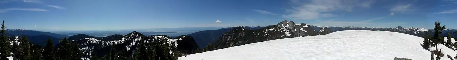 Goat Mountain is a mountain peak rising east of the Crown Pass, located directly north of Grouse Mountain in North Vancouver, British Columbia, Canada. An approximate 8 km, 4 hour, round-trip hike from Grouse Mountain, Goat Mountain is popular with local hikers, as its steep summit tower provides excellent views over the Greater Vancouver area, Howe Sound, Washington state, the Strait of Georgia, Vancouver Island, and the Coast Mountains. It also offers area for bouldering east of its summit.