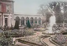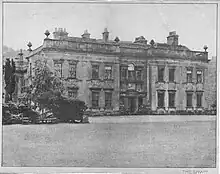 The family home was a double-cube fronted building of brick with stone dressings and a baluster parapet. To the east of this was a five-bedroom dining block that looked out onto the gardens.[4] When last occupied by the family, The Lawn had an outer and inner hall on the ground floor (giving access to a lobby and drawing room), a dining room with adjoining study, billiard room, library and gun room. There were two staircases leading to the various bedrooms, some with adjoining dressing rooms, and also the nursery and servants' quarters.