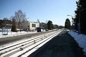 Godlia (pronunciation) is a station on the Østensjø Line (Line 3) on the Oslo Metro. It is the first station after the line diverges from the Furuset Line and is located between the stations of Hellerud and Skøyenåsen, 6.1 kilometers (3.8 mi) from Stortinget. The station was opened as a subway station 29 October 1967. Karl Stenersen was the station's architect.[1] Rail service through Godlia is older, having opened as a tram line already in 1926.[2]