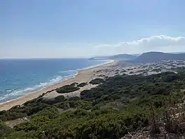 It stretches about four kilometers from Galunopetra (Iyitaş) cape on the east to Jyles cape on the south-west. On the eastern part, the dunes extend up to 500m towards the inland. The beach area is separated into two sections by a small hill, Adatepe, and by a large light colored sand dune without vegetation.[3]