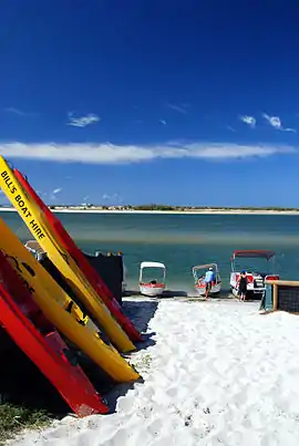 The long sandspit at the northern tip of Bribie Island protects Golden Beach from the Coral Sea.[4] However, this section of the Pumicestone Passage is very narrow and very shallow (less than 2 metres (6 ft 7 in)) with shifting sand and mud banks, which makes the northern sandspit highly dynamic in shape through natural processes of sand/mud buildup and erosion. During storms, waves may cross over the sandspit from the Coral Sea into the Pumicestone Passage, with the potential to break through the sandspit to create new entrances to Pumicestone Passage. The creation of new entrances would impact on Golden Beach and Pelican Waters, which would then be exposed more directly to the stronger wave action of the Coral Sea as opposed to the calmer waters of the Pumicestone Passage.[5] In December 2020, wild weather began creating channels from the ocean through the northern sandspit into Pumicestone Passage.[6]
