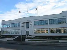 - The Firestone Tyre Company. Built 1928, designed by Wallis, Gilbert and Partners.[3][4] It was the first overseas factory built by the Firestone company of America. The building frontage was demolished during a public holiday in August 1980 shortly before a preservation order was due to be served on it to retain the Art Deco architecture.[5][6] The Art Deco gatehouse was demolished in 2004 to make way for increased parking facilities. The remaining gates, railings, and piers are in a Jazz Modern style and are Grade II listed.[4]