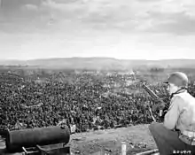 Towards the end of the Second World War, US troops established prisoner of war camps along the River Rhine for the detention of German soldiers. During the conquest of the Rhineland 250,000 German soldiers were captured and, following the destruction of the Ruhr Pocket, another 325,000 joined them. From mid-April 1945 around 660,000 Germans [1] were held in these camps. After the collapse of the Western Front, the Americans – themselves suffering from supply shortages – had to accommodate and care for German prisoners of war as well as two million of their own soldiers. The so-called Rheinwiesenlager ("Rhine Pasture Camps") were intended as transit camps, offering temporary accommodation for the prisoners. The Golden Mile was one of these camps.
