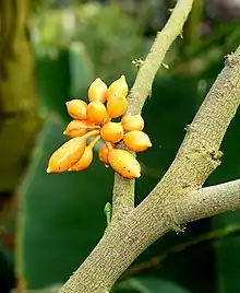 It is a tree reaching 3 to 15 meters in height. Its lance-shaped leaves are hairless and come to a point at their tips. The leaves are arranged in an alternate pattern. Its flowers are solitary, or sometimes in pairs, and axillary. It has 3 fleshy, green sepals. It has 6 long, greenish-yellow, fleshy petals arranged in two rows of 3. The inner petals unite to form a cone. Its flowers have more than 100 stamen with no filaments. The anthers are attached directly to the receptacle and arranged in a triangle. Its gynoecium consist of 14 to 18 pistils that lack styles. Its stigma are long, curved and ribbed. Its oval fruit are about an inch long and have 3 - 5 cinnamon colored seeds. The fruit have a mild pleasant smell.[2][3][4]