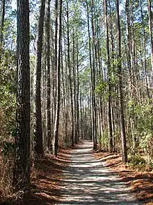 Since the end of the pirate era, the area in and surrounding Goose Creek State Park has been centered on timber production, commercial fishing and small scale, subsistence farming. Lumber companies, such as the Eureka Lumber Company and later Weyerhauser Corporation,[4] acquired extensive tracts of land along the creeks and harvested vasts stands of old growth bald cypress and longleaf pine. Much of the land that is now part of Goose Creek State Park was clear cut.[3] Evidence of the timber industry remains at the park today. Visitors to the park can see the remains of piers and loading docks up and down Goose Creek and an old railroad bed crosses the park.
