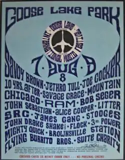 The Goose Lake International Music Festival held August 7–9, 1970, in Leoni Township, Michigan, "was one of the largest music events of its era",[1] and featured many of the top rock music bands of the period.