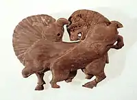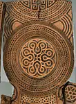 This impression was confirmed by an analysis of the prominent designs at the center of the screen faces, which have now been identified as religious symbols. The rosette represented the Phrygian goddess Matar and the curved legs her two attendant lions, in an abstract version of the figures in the niche of Arslan Kaya, the monumental rock-cut shrine of the Phrygian highlands.[12] The Tumulus MM screens thus took the form of portable shrines of the goddess Matar.