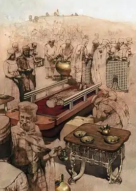 The contents of the tomb, which were largely banquet furnishings, must have been used for the ceremony. Analysis of the food and drink residues produced the menu of the funerary banquet. The feast included a spicy stew, made with barbecued sheep or goat, honey, wine, olive oil, and most likely lentils, seasoned with anise or fennel. The small bronze cauldrons that sat in the tops of the serving stands had contained a mixed fermented beverage of grape wine, barley beer, and honey mead.[16] The beverage served at the king’s funeral has been reconstructed by Dogfish Head Brewery as the award-winning “Midas Touch,” which is now widely available. This collaborative research allowed the funeral ceremony before the burial to be reconstructed in a painting by Greg Harlin.[17]