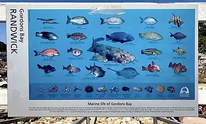 The Gordon's Bay Underwater Trail is a 600-meter underwater trail marked by a chain attached to drums filled with concrete placed at 20-meter intervals along the seabed. Steel plaques along the route provide information about underwater ecology and local aquatic wildlife. The deepest point is 14 meters and along the way you're likely to spot eastern footballer fish and red morwong.[10]