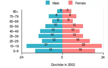 According to the 2002 Poland census, there were 214 people residing in Gorzków village, of whom 48.1% were male and 51.9% were female. In the village, the population was spread out, with 34.6% under the age of 18, 32.7% from 18 to 44, 17.3% from 45 to 64, and 15.4% who were 65 years of age or older.[1]