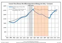 Development of population since 1875 within the current boundaries (Blue line: Population; Dotted line: Comparison to population development of Brandenburg state; Grey background: Time of Nazi rule; Red background: Time of communist rule)