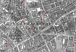 Map showing the location of the graffito (red triangle) in relation to 6 of the murder sites (red circles). Bottom left: Mitre Square (where Catherine Eddowes was found); Bottom right: Berner Street (where Elizabeth Stride was found). Others (clockwise from top): Dorset Street (Mary Jane Kelly), Osborn Street (Emma Elizabeth Smith), George Yard (Martha Tabram), Castle Alley (Alice McKenzie).