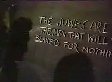 A still from Murder by Decree showing its depiction of the Goulston Street graffito. The film portrays "Juwes" as a Masonic term, and the original graffito was written in cursive script, not capitals.
