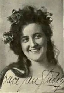 In 1903 Van Studdiford opened the opera Maid Marian and later debuted The Red Feather which was specially written for her. This opera also boasted some of the most elaborate costumes up to that date. She played in and toured The Red Feather for two years. After touring with The Red Feather, Van Studdiford chose her next title part in the opera Lady Teazle which was not performed on Broadway but at several popular music halls throughout the country. In July 1908 she was back on Broadway in The Mimic World. In October 1908 she was at New York's Broadway Theater as Ilma Walden in The Golden Butterfly and toured this opera into 1909. 1910 found Van Studdiford in the popular opera The Bohemian Girl in the part of Arline. In late 1910 she toured in A Bridal Trip before bringing it to Broadway's Herald Square Theater in January 1911 under the name The Paradise of Mahomet.[5] In 1911 she appeared at the Winter Garden Theatre in La Belle Paree as Mimi and later toured in A Bridal Trip now renamed The Paradise of Mahomet. In 1914 Van Studdiford toured the US in Oh! Oh! Delphine playing the title character. Her last recorded performance in an opera or play is in the musical comedy A Trip to Chinatown as Mrs Guyer. In this play Van Studdiford toured many military camps as World War I wound to a finish.[6] This musical was later made into a 1926 silent movie by Fox Studios.[7] After her last stage credit in 1918, she appeared in a small number of silent films using the name Grace Studiford and Grace Studdiford, her last film credit being in 1921.