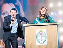 Comedian Martín Bossi parodies the Argentine president Cristina Fernández de Kirchner, next to TV host Marcelo Tinelli.