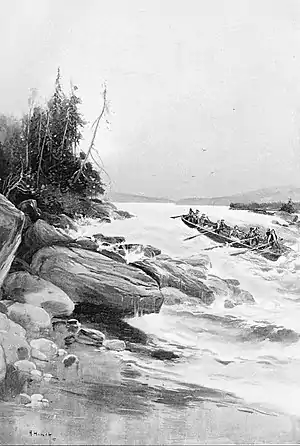 The rapids are found on both sides of an island in the river. In the channel is an island, where the Hudson's Bay Company built a tramway to transport the outfits for all the northern posts.[2][3] The river drops 100 feet (30 m) over 1 mile (1.6 km) at the rapids.[4]