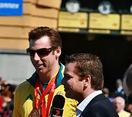 In 2004 he was granted the "Key to the City of Gold Coast" in recognition of his outstanding achievement as a swimming champion.[23] He was named as the Australian Swimmer of the Year in 2005, and was also named the World Swimmer of the Year by Swimming World magazine. In 2009 as part of the Q150 celebrations, Grant Hackett was announced as one of the Q150 Icons of Queensland for his role as a "sports legend".[24] In 2010 he was inducted into the Sport Australia Hall of Fame,[25] and the International Swimming Hall of Fame in 2014.[26]