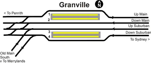 Granville Junction lies immediately to the west of the station and is the junction point of the Main Western and the original Main South lines, now referred to as the Old Main South after the opening of the Lidcombe to Cabramatta bypass.