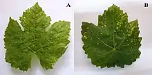 Phytoplasmas are obligate cell wall-less bacterial pathogens (class Mollicutes), and rely on plants and homopterous phloem-sucking insects for biological dispersal. In plants, they are mainly restricted to the phloem tissue where they can move and multiply through the sieve tube elements.[2] Almost identical symptoms of the GY syndrome are caused by different phytoplasmas and appear on leaves, shoots and clusters of grapevine. Typical symptoms include discoloration and necrosis of leaf veins and leaf blades, downward curling of leaves, lack or incomplete lignification of shoots, stunting and necrosis of shoots, abortion of inflorescences and shrivelling of berries. Those symptoms are related to callose deposition at the sieve plates and subsequent degeneration of the phloem. Although no resistant cultivars of Vitis vinifera or rootstocks are known so far, the various grape varieties differ considerably as far as symptom severity is concerned. It ranges from fast decline and death in highly susceptible cultivars to tolerant rootstocks as symptomless carriers of the pathogen. Currently, the only available control strategies include early eradication of infected crops, early eradication of infected source plants (weed control), and chemical control of vectors through regular insecticide treatments.[3]