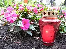 A grave candle, grave lantern, death candle or a death lantern is a type of candle or lantern, which is lit in memory of the dead or to commemorate solemn events. The form of a lantern is commonly used in Christianity, whereas candles are more common in Judaism (where they are known as the Yahrzeit candle).