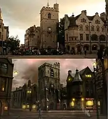 The game features many real world locations. Photo of Carfax Tower (upper) compared to the in-game representation (lower).