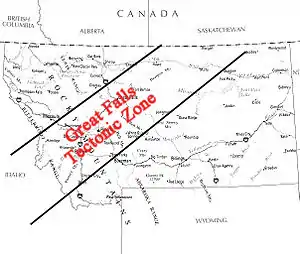 The Great Falls Tectonic Zone is a major intracontinental shear zone between the Hearne craton and Wyoming craton basement rock of the Archean Eon which form part of the North American continent.[1][2][3][4][5] The zone is an area about 100 miles (150 km) wide extending from the southwestern Idaho-Montana border across Montana to the northwestern Montana-Saskatchewan-North Dakota border.[4][6] It is named for the Great Falls of the Missouri River, a major geologic feature of the area. The central and western portions of the zone are believed to be about 1.1 to 3.3 billion years old.[7] The central part of the zone lacks Archean rock, however, leading at least one group of scientists to speculate that it was formed very late in the Paleoproterozoic Era.[7]