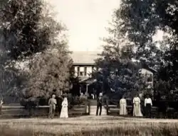 The plantation complex, in 1973, included a two-story main house. The house, then known as Cotton Place,[2] was enlarged and "Victorianized" in 1874–75 by railroad businessman William Morrill Wadley to retire there. The original house, built in the early 1800s, was plantation plain in style. Subsequent owners called it Colaparchee, before Wadley bought it in 1873. He named it "Great Hill" after his birthplace near Brentwood, New Hampshire.[2] The plantation, then 1,360 acres (5.5 km2), cost $6,410 (~$168,459 in 2022).[3] Wadley was buried beside the house, in the Wadley family cemetery, after his death in 1882. His wife, Rebecca, joined him in 1905.[4]