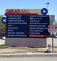 The Great Mall of the Bay Area (often simply called The Great Mall) is a large indoor outlet shopping mall in Milpitas, California built by Ford Motor Land Development and Petrie Dierman Kughn in 1994. It was acquired by Mills Corporation in 2003, and by the Simon Property Group in April 2007. The mall contains approximately 1.4 million square feet of gross leaseable area.[1] The anchor stores are Century Theatres, Kohl's, Dick's Sporting Goods, Home Interiors Furniture, Q, Saks Off 5th, Marshalls, Burlington, Dave & Buster's and the Legoland Discovery Center.
