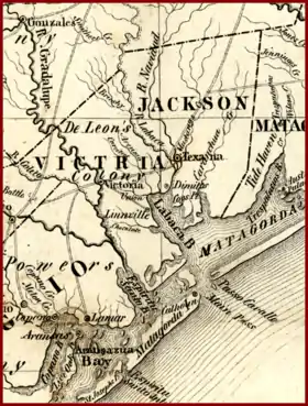 - ↑ The old road from Victoria to Linnville, and the location of the Plácido Benavides ranch (shown on the map as "Placido Venabides"), are shown on an 1858 map of Victoria County. Pressler, Charles W.. Victoria County, Map, November 21, 1858; digital image, (http://texashistory.unt.edu/ark:/67531/metapth89041/), University of North Texas Libraries, The Portal to Texas History, crediting Texas General Land Office, Austin, Texas.